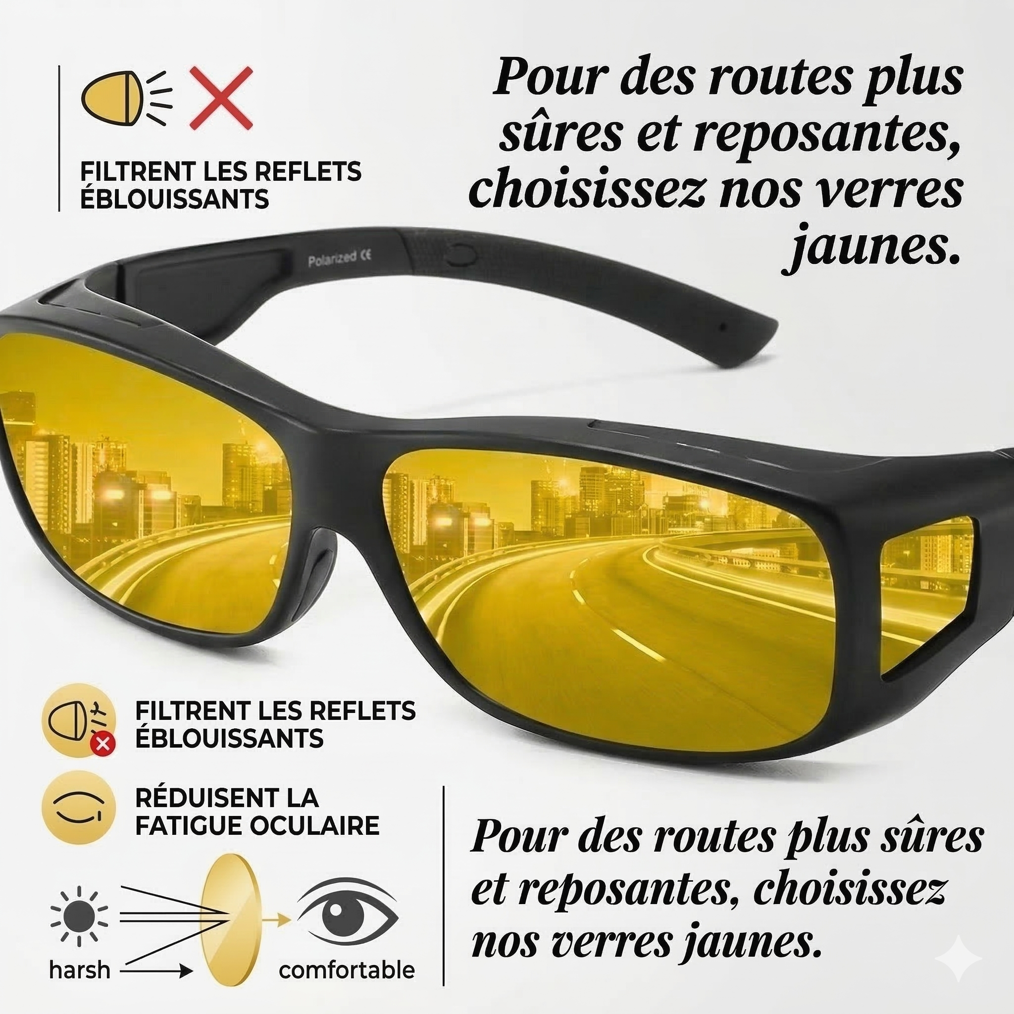 Enfilez nos lunettes et reprenez confiance sur la route, quelle que soit la luminosité.